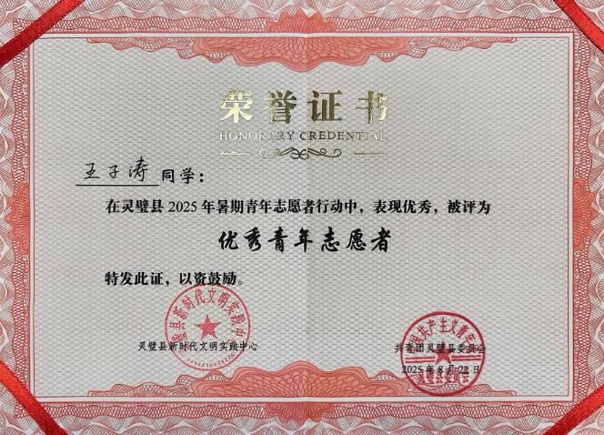 本网讯(信息技术学院 孙颖凯)为深入学习贯彻习近平新时代中国特色社会主义思想,积极落实“时代新人铸魂工程”,引导广大学生在社会实践中厚植家国情怀、增长知识才干,7月至8月,信息技术学院团总支精心组织了“三下乡”大学生暑期社会实践系列活动。其间,2024级人工智能技术应用专业1班班长兼副团支书王子涛凭借突出表现,荣获宿州市灵璧县及灵璧县志愿服务总队联合授予的2025年大学生暑期社会实践“优秀青年志愿者”称号。